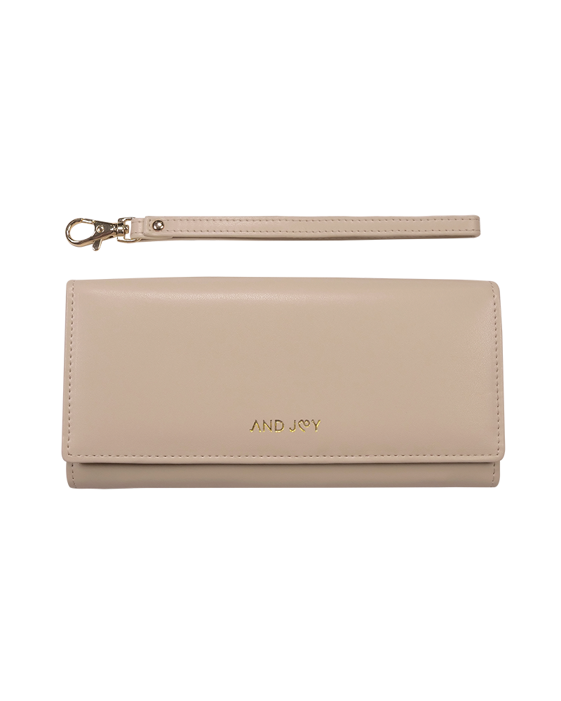 Cartera en símil vegano desnudo, interior rojo.