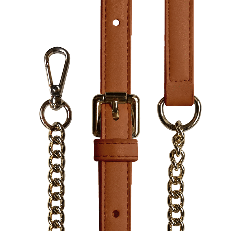 Correa fina bandolera de color caramelo con cadena dorada. Para combinar con el bolso de su elección para crear el bolso ideal. – Pinzas extraíbles en metal dorado – Cadenas en metal dorado Dimensión máxima: 130 cm. Longitud ajustable.