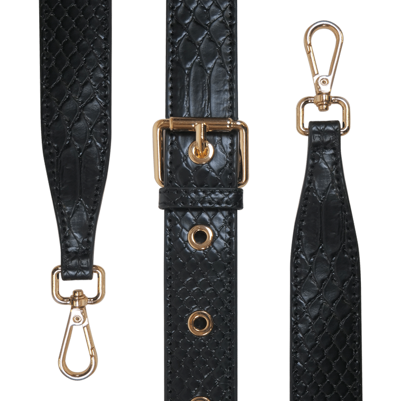 Correa gruesa bandolera ajustable de color negro. Para combinar con el bolso de su elección para crear el bolso ideal. – Símil cuero vegano imitación serpiente – Pinzas desmontables en metal dorado – Ojetes en metal dorado Dimensión máxima: 120 cm. Longitud ajustable.