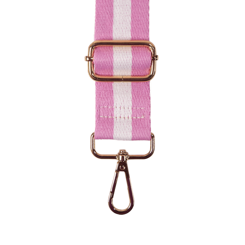 Correa "Marshmallow" a rayas rosa y blanca en tela, ajustable. Para combinar con el bolso de su elección para crear el bolso ideal. – Pinzas desmontables en metal dorado – Correa en nylon Dimensión máxima: 130 cm Ajustable en modo correa corta hasta 66 cm.